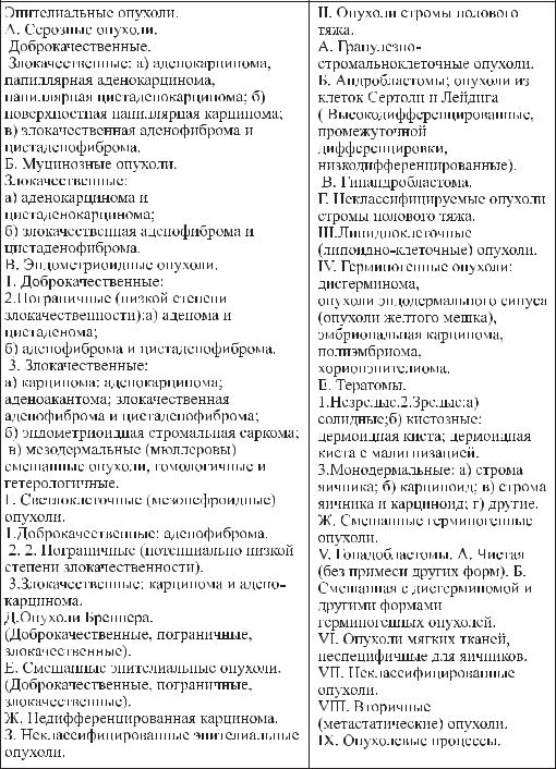 Âсовременной классификации представлено такое разнообразие опухолей яичников по гистотипам, которое не встречается ни в каком другом органе: эпителиальные опухоли, опухоли стромы полового тяжа, липидноклеточные опухоли, герминогенные опухоли, гонадобластома, опухоли мягких тканей, неспецифичных для яичников, неклассифицированные опухоли, вторичные (метастатические) опухоли и опухолевидные процессы.