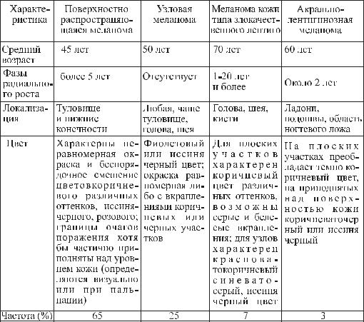 Óузловой меланомы фаза радиального роста практически отсутствует, опухоль сразу прорастает в дерму и начинает метастазировать. Эта опухоль встречается преимущественно у представителей всех рас, но чаще всего ею страдают японцы. Поверхностно распространяющаяся меланома встреча- ется главным образом среди белого населения. У мужчин излюбленная локализация – спина, у женщин – спина и голени. Из диспластических невусов обычно развиваются поверхностно распространяющиеся меланомы.