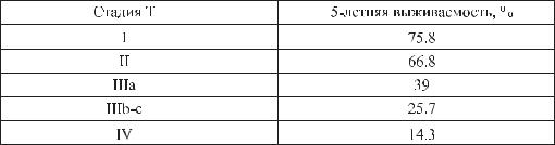 Выживаемость больных раком почки в зависимости от стадии Т (по данным Давыдова М.И., Матвеева В.Б.)