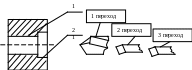 Технологический переход - законченная часть операции, выполняемая одними и теми же средствами технологического оснащения при постоянных режимах и установке, т.е. переходом называется законченная часть операции, характеризуемая постоянством применяемого инструмента и поверхностей, образуемых обработкой. Показанная на рисунке 1.2 схема обработки отверстия осуществляется в три перехода: первый – сверление отверстия 1, второй – растачивание отверстия 1 и третий – растачивание выточки 2.