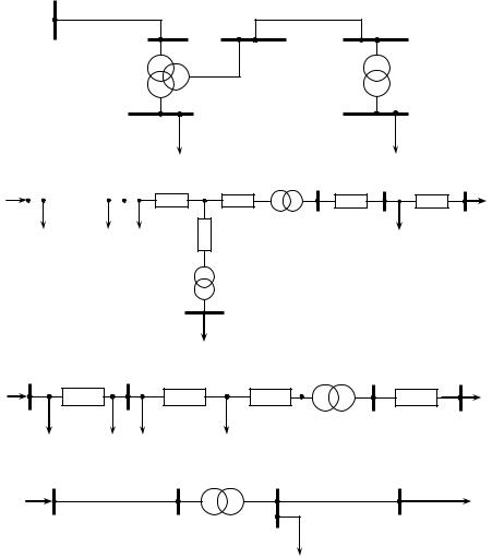 а – схема сети; б – схема замещения; в – упрощенная схема замещения с расчетными нагрузками подстанций; г – схема сети из двух линий с трансформатором связи; д – схема замещения той же сети