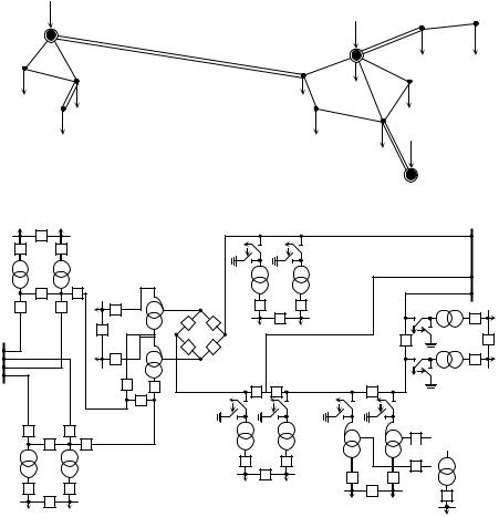 служащие для отключения и включения отдельных электрических цепей, а также устройства, предназначенные для регулирования режима сети (синхронные компенсаторы, батареи статических конденсаторов и т. п.), контроля и автоматического управления. Подстанции служат соединительным звеном между отдельными линиями и потребителями электроэнергии, поэтому они являются неотъемлемой частью электрической сети (рис.1.3).