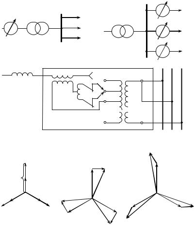 Регулирование напряжения по модулю и фазе называется продольнопоперечным (рис.9.7,е) В этом случае обмотка 3 подключена к фазам А и В. При продольно-поперечном регулировании коэффициент трансформации n - комплексная величина.