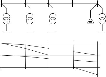 Рис.11.4. Регулирование напряжения с помощью конденсаторных батарей (а) и эпюры распределения напряжения (б).