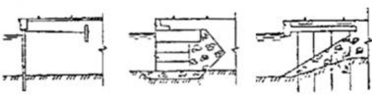 причалы – больверки, представляющие собой закрепленный ряд свай (шпунтовую стенку), забитый вдоль береговой линии и засыпанный со стороны берега каменным и песчаным грунтом. Для обеспечения устойчивости сваи закрепляются стальными тросами за неподвижные плиты (анкеровка). Поверхность причала бетонируется или укладывается бетонными плитами;