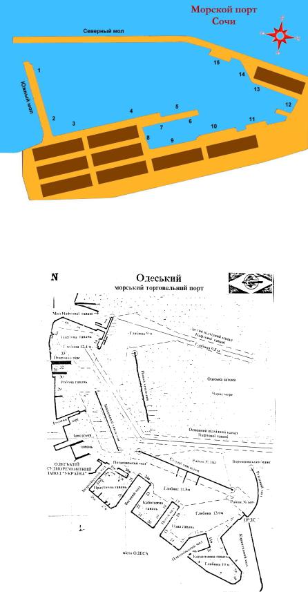 Береговые морские порты создаются на открытом морском берегу, и для защиты их акваторий и причалов от волнения приходится строить оградительные сооружения. Длина этих сооружений в портах на песчаных побережьях измеряется километрами. Если порт размещается в естественной, частично защищенной бухте, то длина оградительных сооружений бывает небольшой. Примеры : Сочи, Марсель, Одесса.
