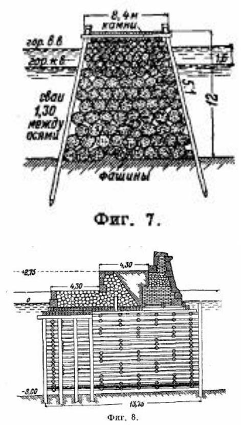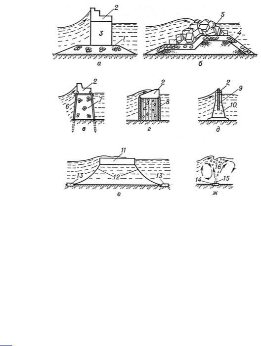 а- гравитационная стенка вертикального профиля, б- откосного профиля, в - вертикальная стенка свайной конструкции; г — вертикальная стенка из цилиндрических оболочек; д — сквозной волнолом; е — плавучий волнолом; ж