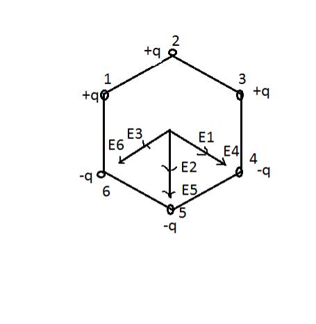 Пусть положительные заряды занимают положения 1, 2, 3, а отрицательные – 4, 5, 6 согласно рис.1.