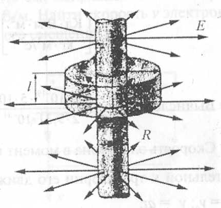 Мысленно вырежем в пространстве цилиндр высотой L и радиусом оснований r. Высота цилиндра должна быть значительно меньше длины заряженного цилиндра, создающего поле (рис.3), а ось совпадать с его осью. Интеграл по замкнутой поверхности цилиндра в формуле (1) можно разбить на три: поток вектора сквозь верхнее основание цилиндра, поток вектора сквозь нижнее основание цилиндра и поток вектора сквозь боковую поверхность цилиндра.