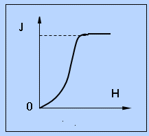 Для ферромагнетиков намагниченность J зависит от H нелинейно (рис. 16). Предположим, что при Н=0 начальный магнитный момент ферромагнетика был равен нулю. Вместе с ростом напряженности поля начинается нелинейное нарастание намагниченности, а затем достигается насыщение и J не изменяется при дальнейшем увеличении напряженности магнитного поля Н. Данная зависимость называется основной или нулевой кривой намагничивания, так как первоначально намагниченность была нулевой. Такая зависимость впервые была получена русским ученым Столетовым (1872 г.).