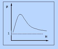 Существенной особенностью ферромагнетиков являются огромные величины магнитной проницаемости и магнитной восприимчивости. Например, для железа μмах ≈ 5000. Для ферромагнетиков величины магнитной восприимчивости и магнитной проницаемости являются функциями напряженности магнитного поля Н (рис.18). С ростом напряженности поля значение μ сначала быстро возрастает до μмах, а затем уменьшается, приближаясь к значению μ=1 в очень сильных полях. Поэтому, хотя формула В = μμ0Н остается справедливой и для ферромагнитных веществ, но линейная зависимость между В и Н нарушается.