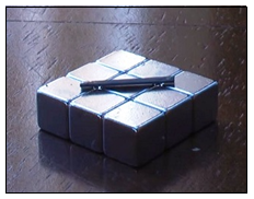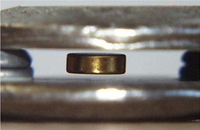 Редкоземельный магнит с индукцией всего 1Тл может висеть между пластинами висмута (рис. 13), а в магнитном поле с индукцией 11Тл можно между пальцами стабилизировать «левитацию» маленького неодимового магнита, поскольку руки человека являются диамагнетиком, как и вода.