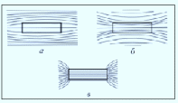 Вещества, образующие третью группу и называемые ферромагнетиками, представляют наибольший интерес для науки и техники. Ферромагнетики – твердые кристаллические вещества, обладающие самопроизвольной (спонтанной) намагниченностью, то есть в отсутствие внешнего поля магнитные моменты в пределах достаточно больших областей порядка 10-6 – 10-5м ориентированы одинаково. Атомы таких веществ обладают отличным от нуля магнитным моментом. В отличие от слабомагнитных диа- и парамагнетиков, ферромагнетики - это сильномагнитные вещества. Их внутреннее магнитное поле может в сотни и тысячи раз превосходить внешнее. Для ферромагнетиков χ и μ положительны и могут достигать очень больших значений, порядка ~103. Только ферромагнетики могут быть постоянными магнитами. На рис. 15 представлено распределение силовых линий магнитного поля для диамагнетика – рис. а, парамагнетика – рис. б, и ферромагнетика – рис. в