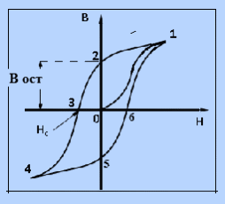 Доведем намагниченность тела до насыщения, повышая напряженность внешнего поля (на рисунке кривая 0-1), а затем будем уменьшать Н. При этом зависимость В(Н) следует не по первоначальной кривой 0-1, а по новой кривой 1-2. При уменьшении напряженности Н магнитная индукция В уменьшается. При Н=0 магнитная индукция имеет ненулевое значение Вост, которое называется остаточной индукцией. Если затем приложить внешнее поле обратного направления, то В обращается в нуль (точка 3). Значение напряженности поля Нс, при котором индукция поля внутри ферромагнетика равна нулю, называется коэрцитивной силой. Продолжая действовать на ферромагнетик магнитным полем, опять достигнем насыщения (точка 4). Уменьшая внешнее поле с напряженностью Н – получим остаточную индукцию (точка 5). Затем размагнитим образец – точка 6, и, соответственно, получим кривую 1-2-3-4—5-6-1, называемую петлей гистерезиса. В данном случае реакция поля внутри образца (В ) как бы отстает от вызывающих ее причин (Н).