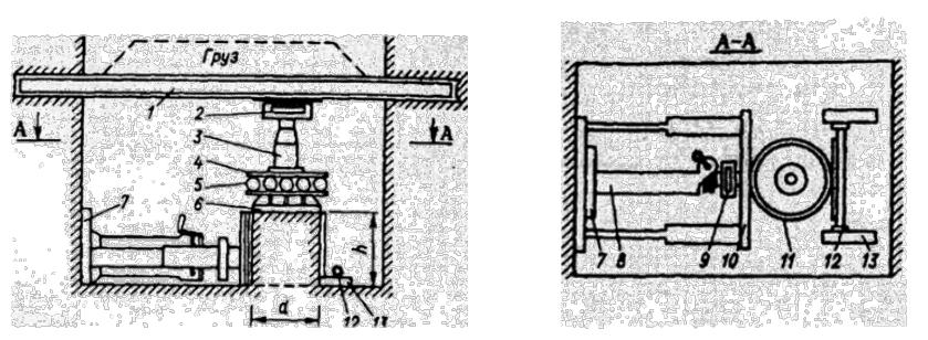 1 – упорная балка; 2,9 – динамометр; 3,8 – домкрат; 4 – жесткая плита; 5 – роликовая опора; 6 – штамп; 7 – упорная стенка; 10 – подвижная стенка; 11 – обойма с грунтом; 12 – катки; 13 – направляющая