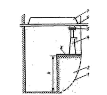 1 – поверхность обрушения; 2 – целик грунта; 3 – штамп; 4 – домкрат; 5 – динамометр; 6 – упорная балка; 7 – нагрузка