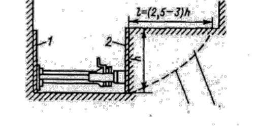 1 – неподвижная упорная стенка; 2 – подвижная упорная стенка; 3 – поверхность скольжения; 4 – целик грунта