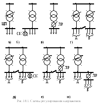 Схемы, изображенные на рис.18.1,г - е, целесообразно использовать в тех случаях, когда мощности нагрузки линий группы А и линий группы Б примерно одинаковы. Если же, например, мощность нагрузки линий группы Б значительно меньше мощности нагрузки линий группы А, то в этом случае целесообразнее применять схему, изображенную на рис.18.1,ж. Здесь основная нагрузка подстанции (линии группы А) обеспечивается централизованным регулированием напряжения от основного трансформатора с РПН, а линии группы Б с меньшей нагрузкой обеспечиваются централизованным регулированием напряжения от дополнительного линейного регулятора ЛР.