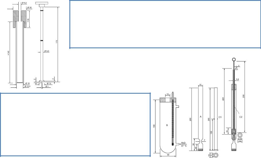 Б. Помещают стеклянную трубку с 5 мл воды в водяную баню (36,5 ±0,5 С), опускают суппозиторий зауженным концом вниз и сверху помещают стержень С1 (30±0,4 г) или С2 (7,5±0,1 г). Регистрируют время, когда стержень достигнет сужения трубки