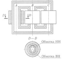 Рис. 1.8. Однофазный трансформатор с бронестержневым магнитопроводом