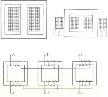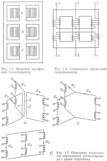 На рис. 1.6 показан стержневой магнитопровод трехфазного трансформатора. Возможность применения магнитопровода с тремя стержнями и двумя ярмами для трансформации в трехфазных цепях показана на рис. 1.7. Если взаимно расположить три однофазных трансформатора, как показано на рис. 1.7, а, то три стержня 1–3 можно конструктивно объединить в один. Но так как в трехфазной системе гео-