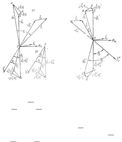 90°, а вектор намагничивающего тока I0 несколько опережает вектор потока m . Вектор первичного тока I1 I2 I0 . Чтобы построить вектор первичного напряжения U1 OA, нужно сложить составляю-