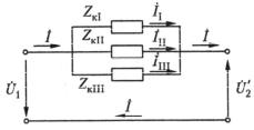 обмоток и равными коэффициентами трансформации. Пренебрегая намагничивающими токами и используя упрощенную схему замещения трансформатора, схему параллельной работы трех трансформаторов можно представить в виде, изображенном на рис. 9.9.