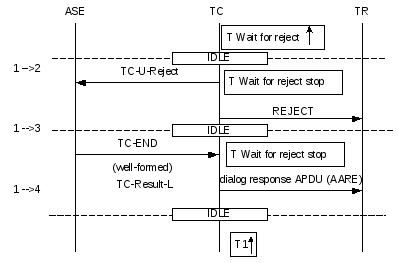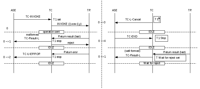 Идентификатор операции может быть освобожден пользователем ТС на местном окончании. Идентификатор также может быть освобожден при таймауте вызова операции, что указывается на нижеследующей диаграмме конечного автомата функционирования протокола подсистемы транзакционных возможностей ОКС 7 класса 1.