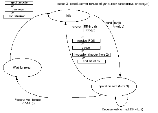 При операциях класса 3 докладывается только об успехе операции. В случае ошибки протокола, может иметь место неприем. При вызове операции класса 3 на вызывающей стороне идентификатор вызова сохраняется активным до приема отклика и не может более быть не принятым или до отклика или ситуации завершения. Конечный автомат функционирования протокола подсистемы транзакционных возможностей класса 3 представлен на диаграмме ниже.