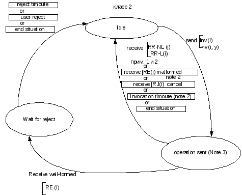При операции класса 2 докладывается только об ошибках. В случае ошибки протокола может иметь место неприем. При вызове операции класса 2 идентификатор вызова на вызывающей стороне сохраняется активным до приема отклика и не может быть далее не принят, или до события отмены таймаута или ситуации завершения. Конечный автомат функционирования протокола подсистемы транзакционных возможностей класса 2 представлен на нижеследующей диаграмме.