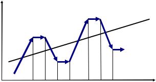 Тренд экономического роста (тренд потенциального ВВП) отражает лишь тенденцию, направление движения экономики. В действительности экономика развивается неравномерно, циклически, через постоянные отклонения от тренда, через спады и подъемы (рис. 3.8).