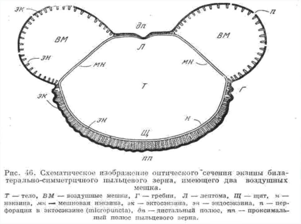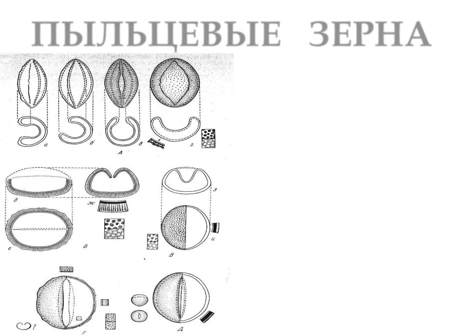 Билатеральносимметричные лептомные пыльцевые зерна гинго билоба (А) и различных саговниковых (Б, В, Г, Д)