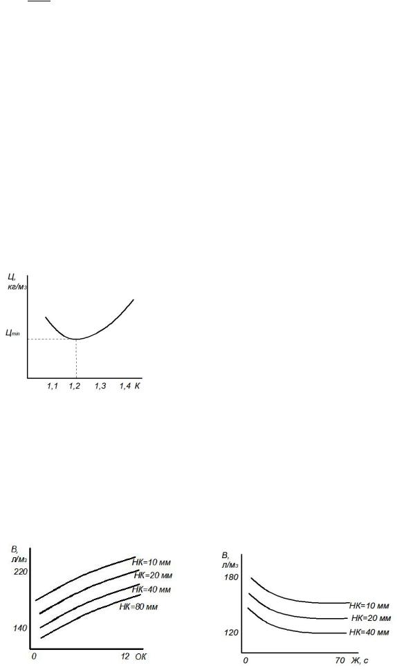 Зная прочности и расходы цемента на 1 м3 бетона для каждого состава, строится график зависимости расхода цемента от коэффициента раздвижки зёрен крупного заполнителя.