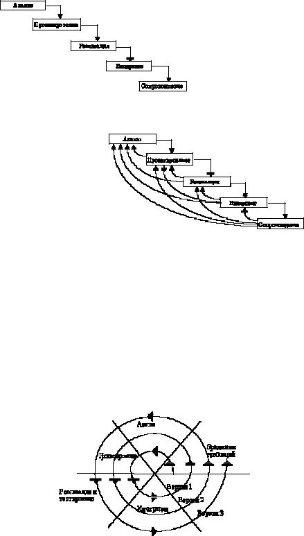 В процесі створення ПЗ постійно виникала потреба в поверненні до попередніх етапів і уточненні або перегляді раніше ухвалених рішень. В результаті реальний процес створення ПЗ приймав наступний вигляд (мал.2):