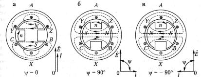 Если ток I опережает ЭДС E на 90 , то максимум тока в фазе A наступает по сравнению со случаем рис. 2.4, а на четверть периода раньше и в этот момент времени ротор занимает по сравнению с рис. 2.4, а положение, повернутое на 90° против направления вращения (рис. 2.4, в). Токи фаз на рис. 2.4, в имеют такие же значения, как и на рис. 2.4, а. Из рис. 2.4, в видно, что при опережающем токе и