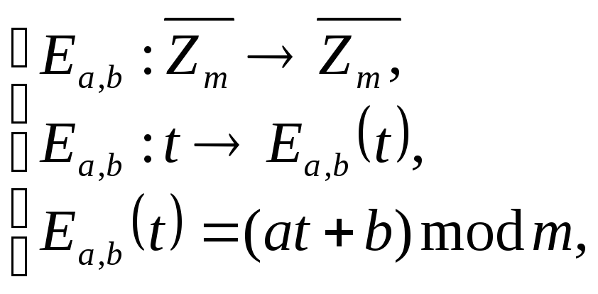 У такому перетворенні літера, що відповідає числу t, замінюється літерою, що відповідає числовому значенню (at+b) за модулем m.