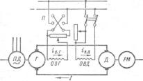 Наиболее типичными системами подобного рода являются: А) система Леонарда или система генератор-двигатель (сокращенно ГД) и Б) система Леонарда-Ильгнера или система генератордвигатель с маховиком (сокращенно ГДМ). Одна из возможных принципиальных схем системы ГД показана на рис. 5.18.