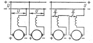 Рис. 5.26. Параллельное и последовательное включение двигателей последовательного возбуждения для изменения скорости вращения