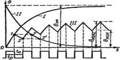 Во время второго периода работы нагревание идет по тому участку кривой 1, начало которого соответствует значению , достигнутому в конце первой паузы в работе.