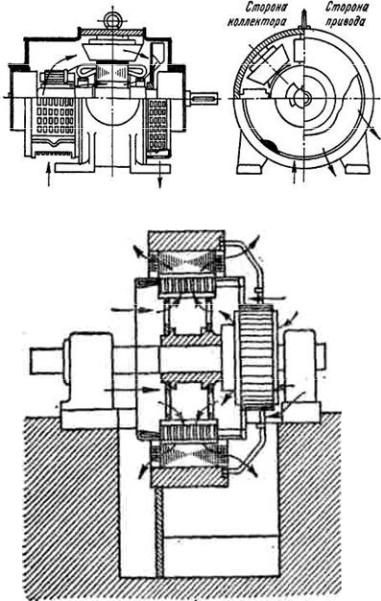 ным каналам между якорем и валом или по аксиальным вентиляционным каналам в сердечнике якоря. Потоки воздуха омывают также коллектор. Воздух поступает в машину с одного ее конца и выбрасывается с другого.
