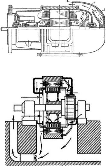 Машины с независимой вентиляцией. Обычно такие машины тоже охлаждаются воздухом, который подается в машину с помощью отдельного вентилятора (рис. 7.7). Такую вентиляцию называют также принудительной. Иногда вентилятор со своим приводным двигателем устанавливается на корпусе вентилируемой машины.