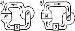 Применительно к крупным машинам эти меры непригодны. Такие машины невозможно охлаждать с наружной поверхности, так как эта поверхность возрастает пропорционально квадрату линейных размеров, а потери в машине – пропорционально кубу линейных размеров. Разборка и сборка крупной машины, ее чистка являются весьма трудоемкими и дорогими операциями. Поэтому в крупных машинах переменного тока, а в ряде случаев также в крупных машинах постоянного тока применяется замкнутая система вентиляции (рис. 7.8). При такой вентиляции воздух циркулирует по замкнутому циклу; проходит через машину М , воздухоохладители О , вентилятор В и снова попадает в машину. Возможно использование как нагнетательной (рис. 7.8, а), так и всасывающей I вентиляции (рис. 7.8, б).