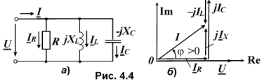Векторная диаграмма входного напряжения и токов цепи при XL > XС приведена на рис. 4.4б, где IR и jIX = jIС jIL – активная и реактивная составляющие комплекса тока I цепи; = arctg(IX/IR).
