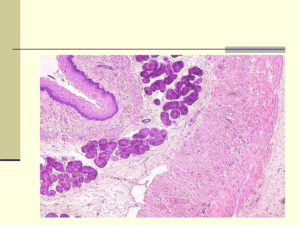-В верхней части пищевода эти слои представлены: поперечно-полосатой тканью
