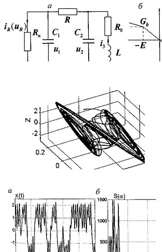 Пример 6.1. Система (цепь) Чуа. Около 15 лет назад специалисты по электронным целям Л. Чуа и Т. Мацумото предложили простую электронную цепь с одним нелинейным элементом, способную генерировать весьма разнообразные, в том числе хаотические, колебания.