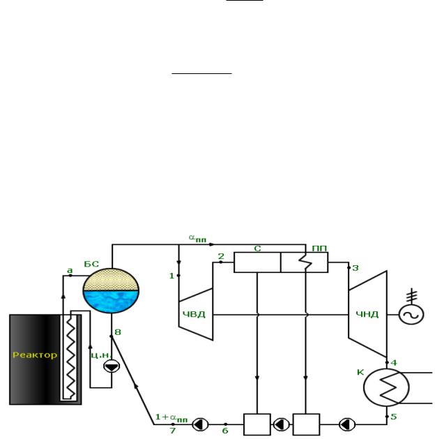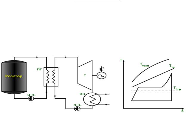 Вводоводяном энергетическом реакторе (ВВЭР) в качестве замедлителя и теплоносителя используется вода, рабочим телом также служит вода. Схема АЭС является двухконтурной. В первом контуре циркулирует теплоноситель - вода под давлением. Во втором контуре на входе в турбину СНП (х = 1). При расширении СНП в турбине при промежуточном давлении