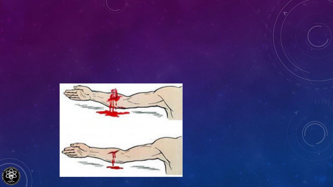 •кровь истекаетбыстро,под давлением, частопульсирующейструей, ярко-алогоцвета. Скоростькровопотеридовольно высокая. Объем кровопотеризависит от калибра сосудаи характераповреждения. При повреждении крупныхсосудов в течение нескольких минут может возникнуть кровопотеряне совместимаяс жизнью.