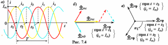 7.1.2. Вращающееся магнитное поле (в. м. п.) статора. При подключении двигателя к трехфазной сети в обмотках статора протекают токи ia, ib и ic (рис. 7.4а). МДС каждой обмотки создаёт магнитный поток, вектор которого совпадает с осью соответствующей катушки. Если ток ia = Im, то ток ib = ic = Im/2 (при t = t1, рис. 7.4а).