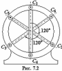 При этом вектор результирующего магнитного потока Фmp = Фma + Фmb + Фmc совпадает с осью катушки С1 − С4 (фаза А) (рис. 7.4б). В моменты времени t = t2 и t = t3 (см. рис. 7.4a) результирующий вектор Фmp будет совпадать с осями катушек соответственно С2 − С5 (фаза В) и С3 − С6 (фаза С) (рис. 7.4в). Очевидно, что за один период Т изменения напряжения сети (см. рис. 7.4а) вектор Фmp результирующего магнитного поля сделает один оборот.