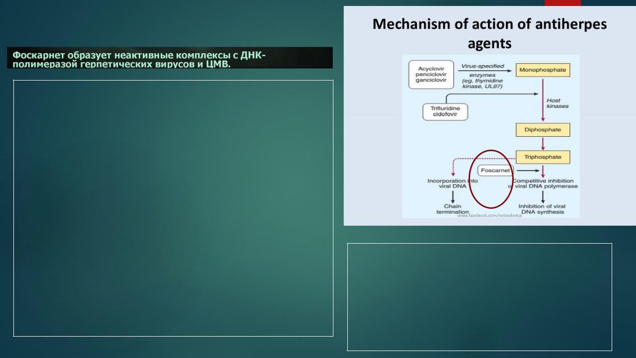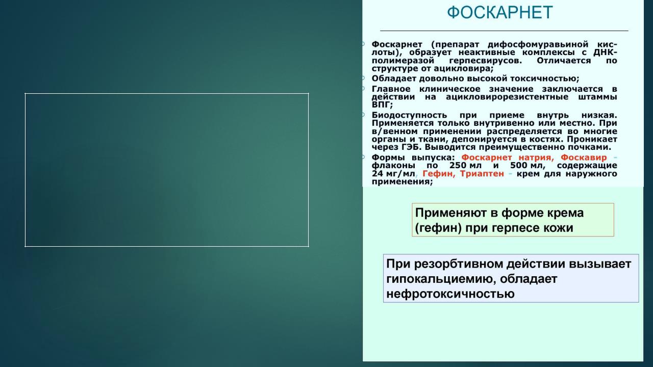 Фоскарнет (тринатрия фосфоноформат) является органическим аналогом неорганического пирофосфата. Вводится в/в, обладает высокой нефротоксичностью.